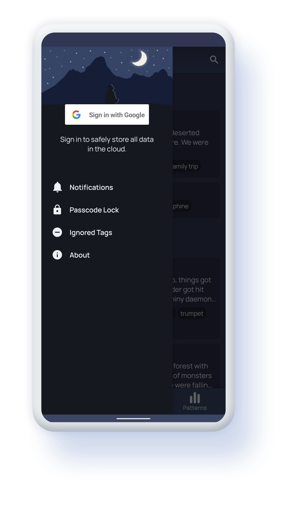 Log in with Google to always keep your dreams safe and secure in the cloud. Log in to as many devices as you want and all your dreams will stay in sync.