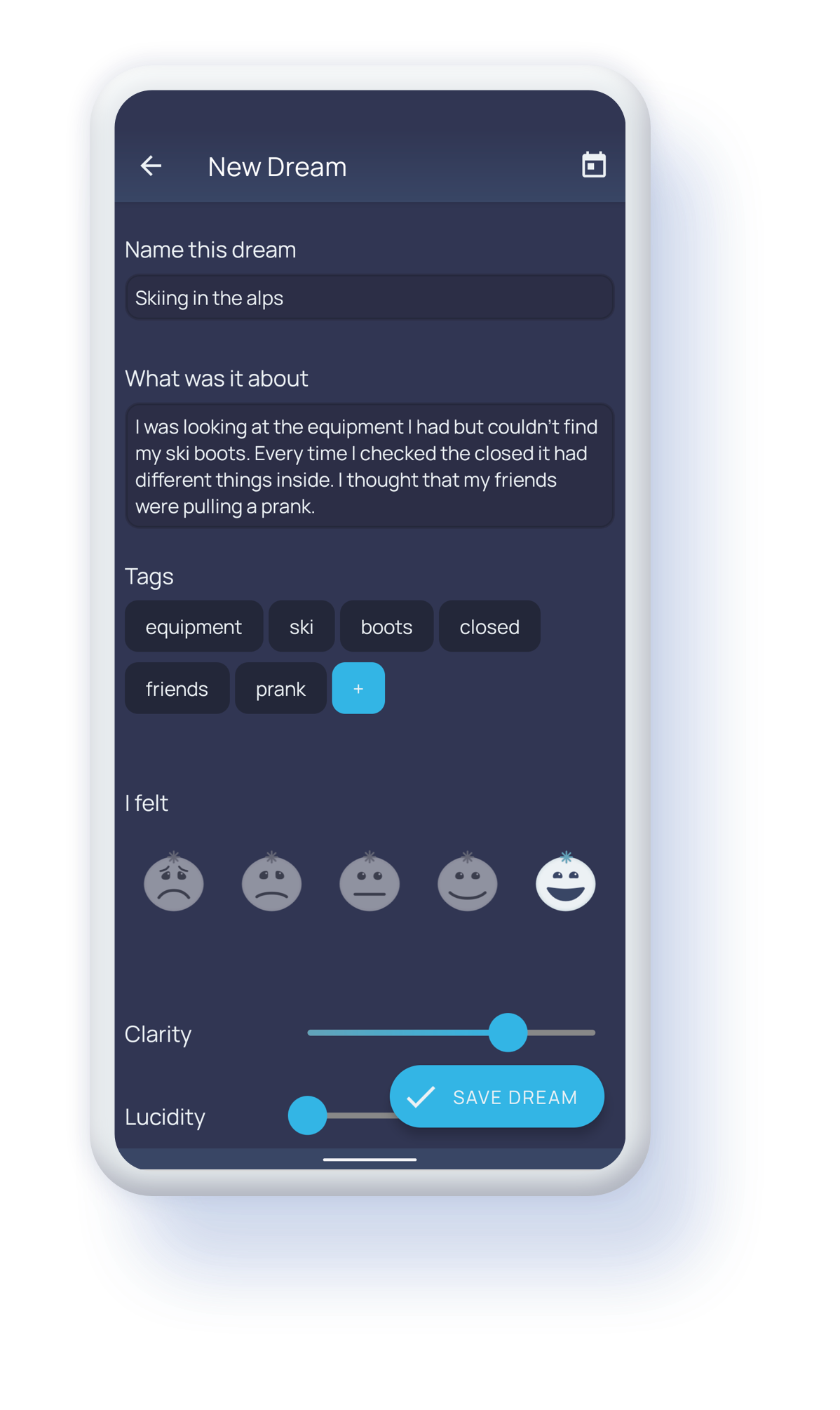 Simple and quick form allows you to focus on what's important and dark interface makes it comfortable to add your dreams in the middle of the night.